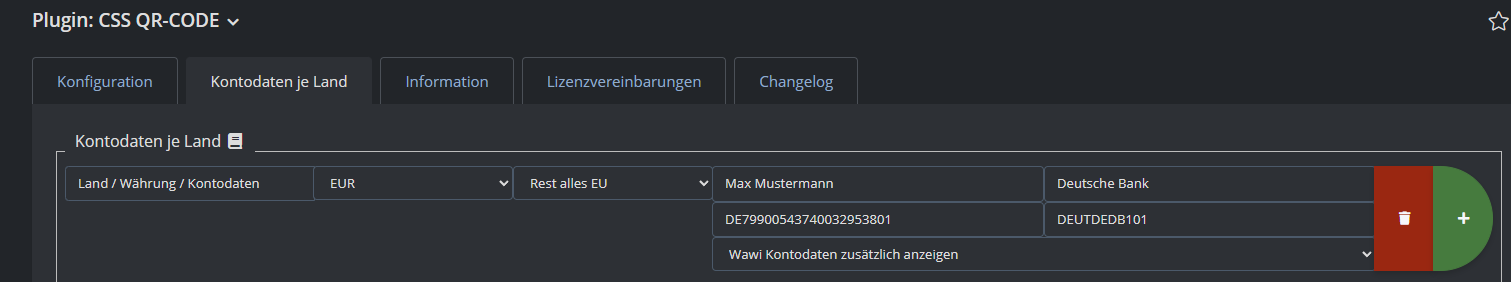 Aktivieren oder deaktivieren Sie das Plugin in dem Tab Konfiguration, zusätzlich stellen Sie dort ein, ob sich die Bankdaten nach dem Rechnungs- oder Lieferland richten.