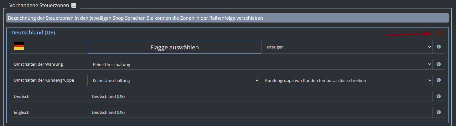 Es werden alle von der WAWI übertragene Steuerzonen angezeigt, Sie haben die Möglichkeit, diese jeweils zu konfigurieren und die Sortierung der angezeigten Zonen zu ändern.